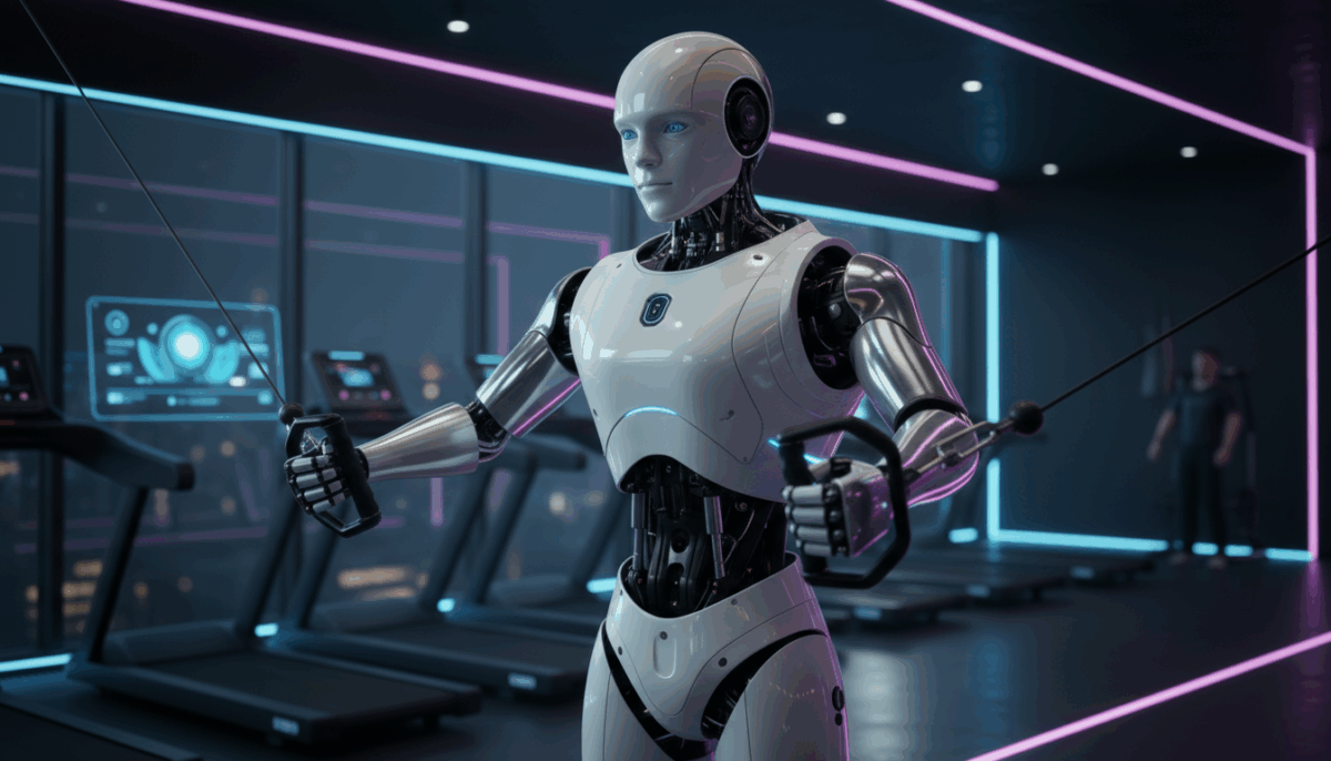 Humanoid robot with white armored body and chrome joints shaking hands with a man in a modern fitness studio, illuminated by cool blue neon lighting.